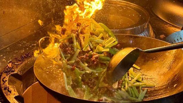 明厨间里,厨师正在烈火烹油;服务员上菜前先来一套“左手右手慢动作”,介绍自家的招牌菜;炒好的菜带着炉子端上桌,火苗舔着锅底,肉片滋滋作响;氛围感瞬间拉满,食欲升腾。