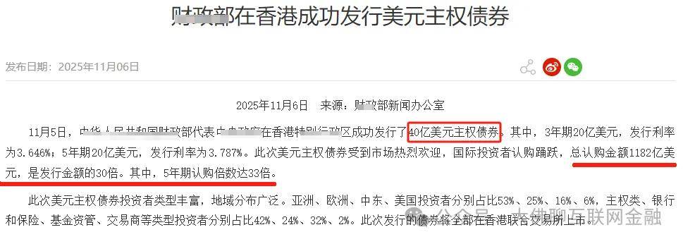 就刚过去的11月初,国内还在香港发了40亿的美元债,其中三年期和五年期各20亿美元,发行利率也不是很高,在3点几左右,但卖得非常好,40亿的额度,就有1182亿的资金认购,认购倍数达到了30倍以上。可见国内主权债券在全球范围内的信用背书还是很不错的。