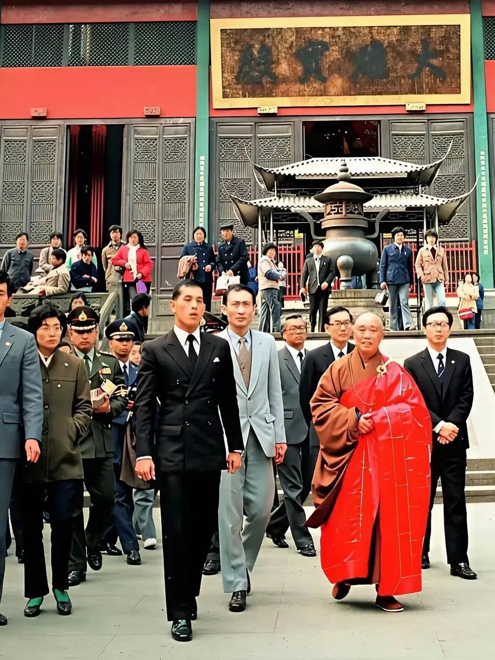 你看,这是1987年3月,他作为王储,代表老爹普密蓬国王访华期间,受邀参观灵隐寺。