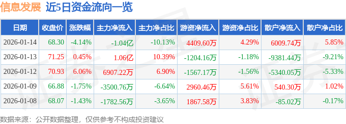 证券之星消息,截至2026年1月14日收盘,信息发展(300469)报收于68.3元,下跌4.14%,换手率5.93%,成交量14.73万手,成交额10.28亿元。