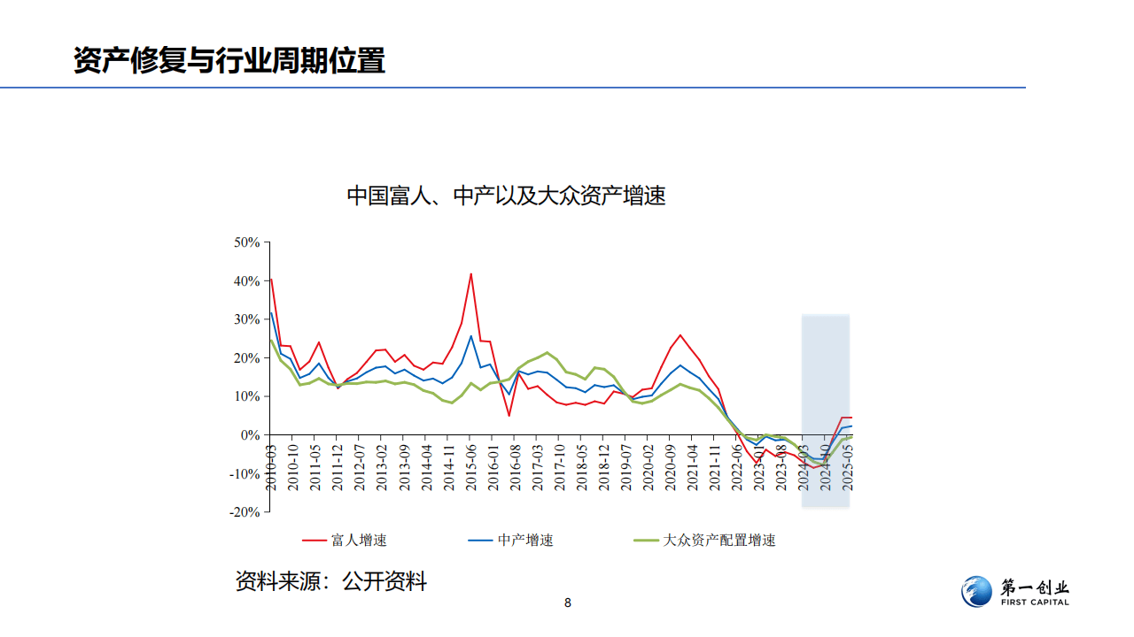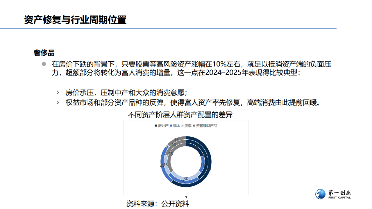 与以往认知不同,当前中国奢侈品消费的核心驱动力已从工资收入转向资产变动。研究指出,高净值人群的资产配置中,股票、理财等高风险资产占比较高,其财富增长与奢侈品消费意愿紧密相关。当权益市场出现反弹时,这部分人群的资产得以率先修复,并迅速转化为高端消费支出。相比之下,以房产为主要资产的中产阶层,其消费信心仍受房地产市场态势影响,修复进程明显滞后。这种分化使得珠宝、腕表等兼具资产保值与情感价值的“重奢”品类表现出了更强的穿越周期韧性,成为本轮弱复苏的领跑者。