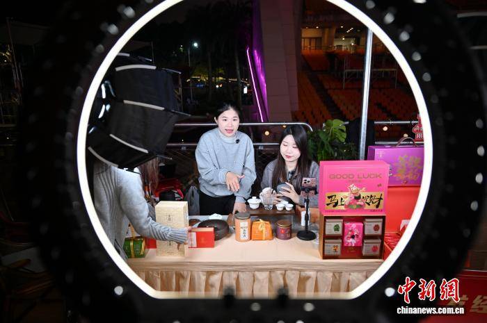 1月25日晚,请到广东过大年·广东文旅邀您来 —— 广货行天下 湾区购物嘉年华发布仪式在广州市海心沙举行。图为工作人员通过直播推介潮州凤凰单丛茶等产品。中新社记者 陈楚红 摄