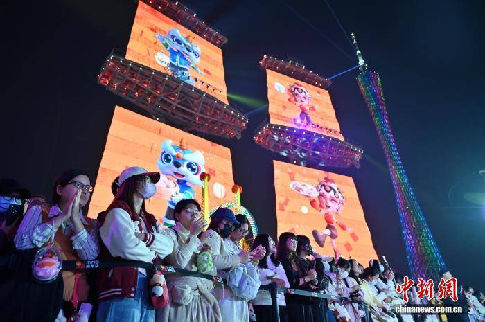 1月25日晚,请到广东过大年·广东文旅邀您来 —— 广货行天下 湾区购物嘉年华发布仪式在广州市海心沙举行。图为活动现场的表演吸引民众。中新社记者 陈楚红 摄