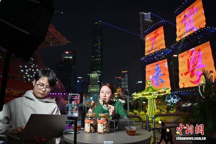 1月25日晚,请到广东过大年·广东文旅邀您来 —— 广货行天下 湾区购物嘉年华发布仪式在广州市海心沙举行。图为工作人员通过直播推介新会陈皮。中新社记者 陈楚红 摄