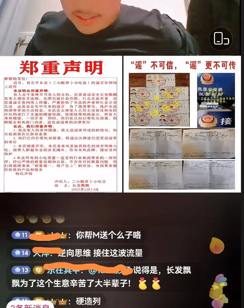 为了让更多人知道自己的店是被恶意造谣,张鑫在抖音上直播了将近一个月,放上血检报告、辟谣声明,和对方的道歉视频。直播间里有人说,要“接住这波流量”。