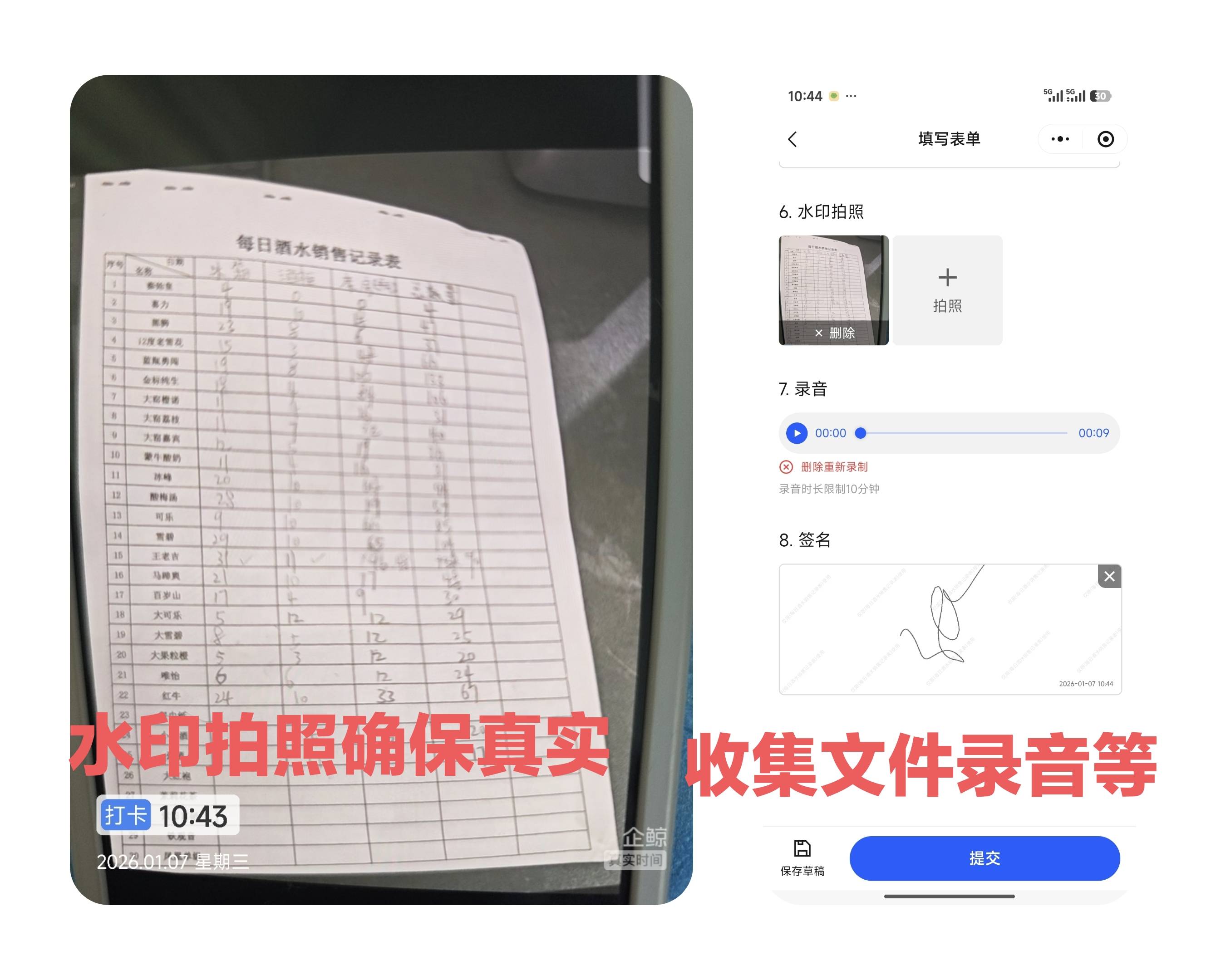 为防数据造假,还能开启 “水印拍照”(照片自带时间地点)、“手写签名” 功能,确保数据真实。