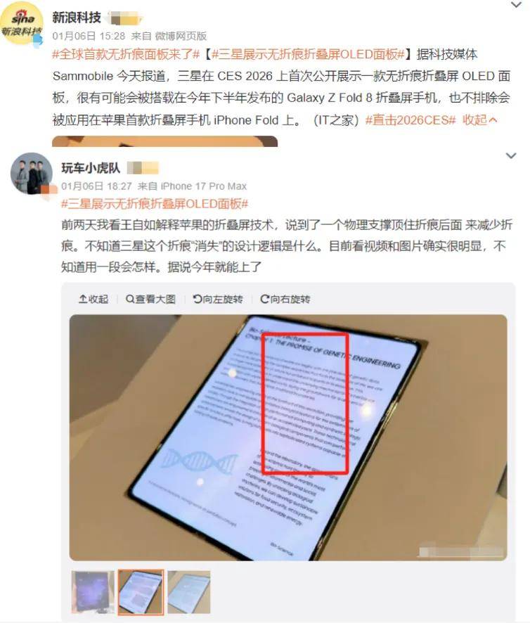 1、无折痕时代真的要来了:三星在CES 2026上展示了几乎无折痕面板技术,使用了激光钻孔金属背板来分散应力,而且三星还可能在这块新面板中加入第二层超薄玻璃;