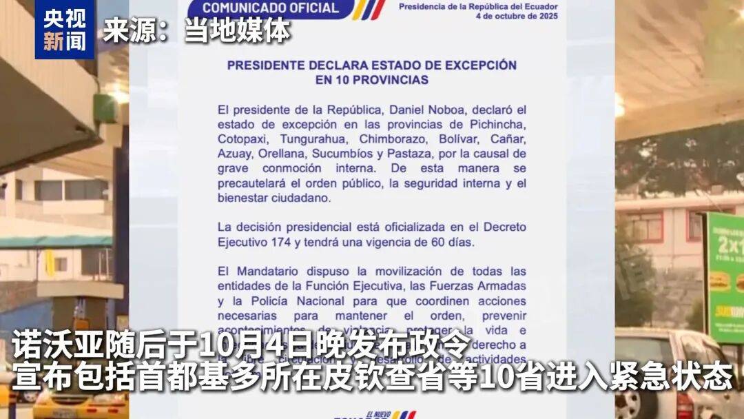 诺沃亚10月4日晚发布政令,宣布因大规模抗议和全国罢工等严重内部动荡,首都基多所在的皮钦查省、科托帕希省等10个省进入为期60天的紧急状态。