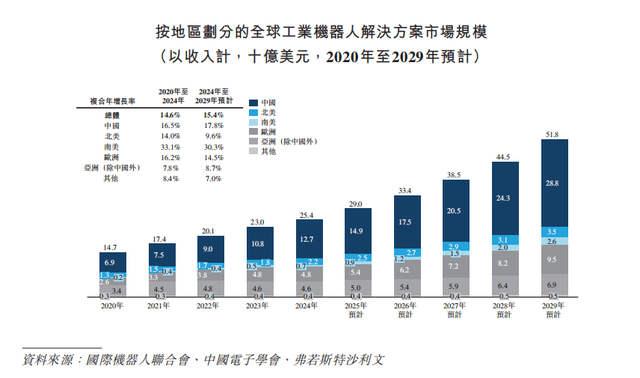 根据弗若斯特沙利文数据,全球工业机器人解决方案市场规模持续增长,2020-2024年复合年增长率达14.6%,2024年达254亿美元,预计2029年增至518亿美元。中国作为核心市场,增速更为显著,2024年复合增速16.5%,2029年市场规模预计达288亿美元,占比55.6%。