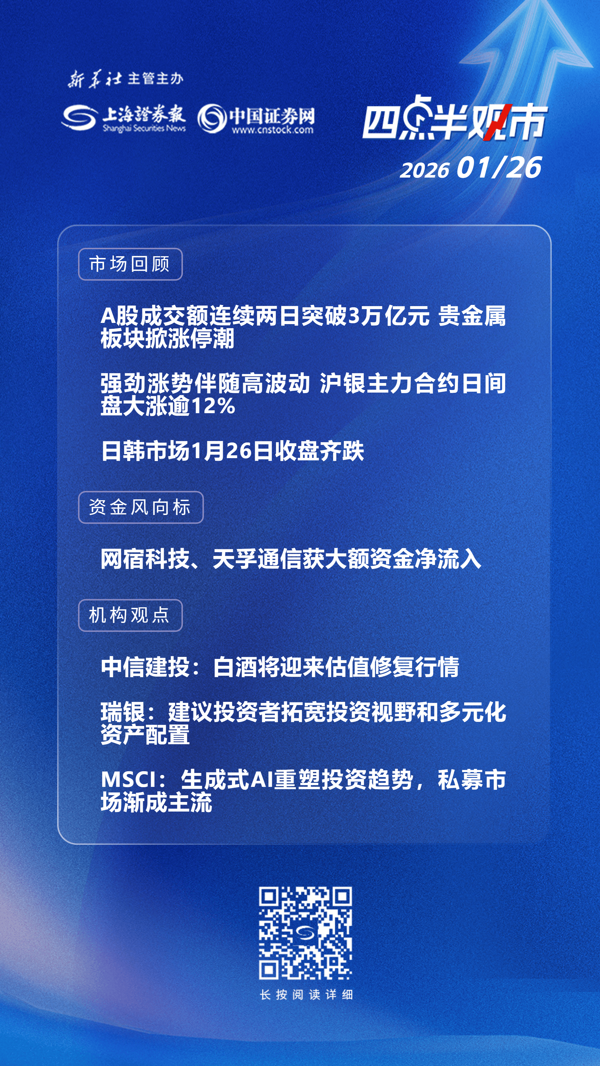 A股成交额连续两日突破3万亿元,贵金属板块掀涨停潮;日韩市场1月26日收盘齐跌;网宿科技、天孚通信获大额资金净流入;中信建投:白酒将迎来估值修复行情。