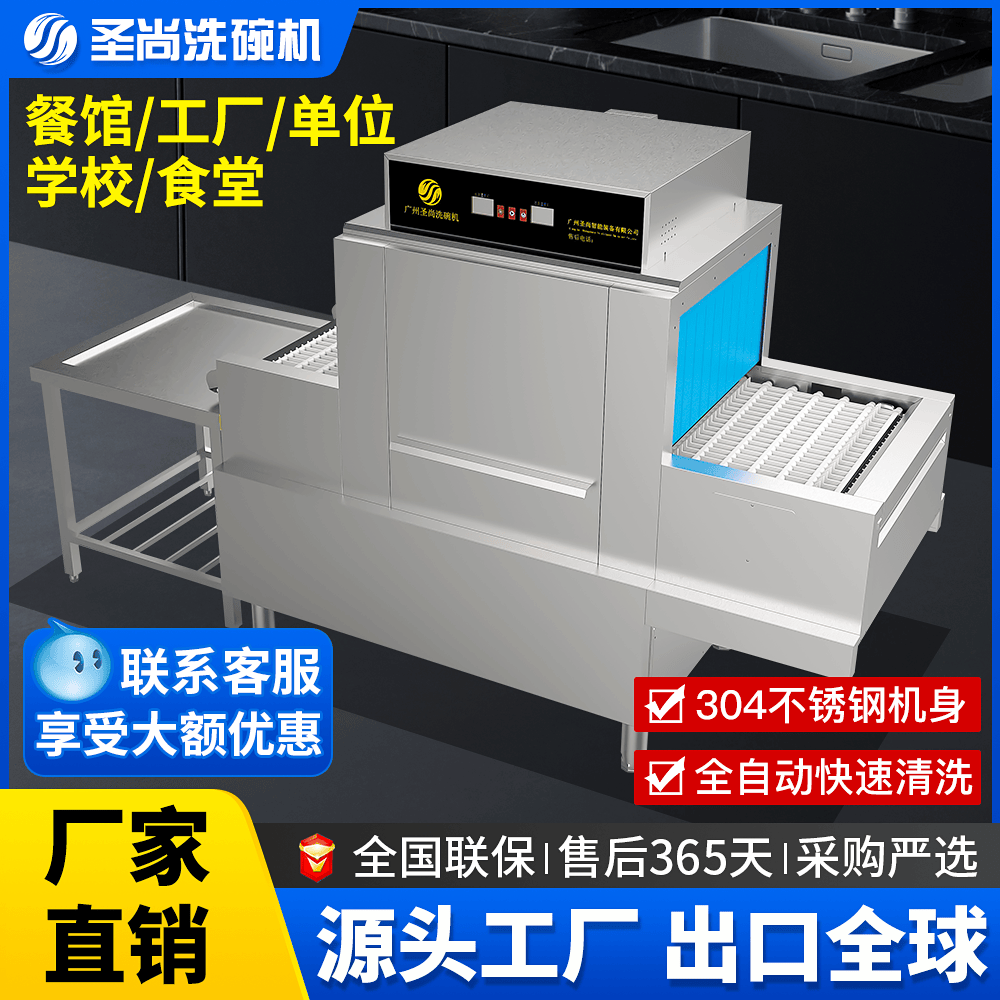 广州圣尚智能装备有限公司生产的圣尚品牌商用洗碗机覆盖上述三类产品形态,设备主体采用SUS304不锈钢材质,配件符合食品接触材料标准。该系列产品的设计基准包括循环水利用、自动温控、分档作业周期等功能模块,针对不同餐位规模与场所类型提供差异化配置方案。