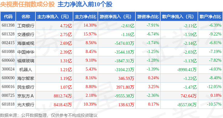 资金流向方面,央视责任(399555)指数成份股当日主力资金净流出合计3.11亿元,游资资金净流出合计12.5亿元,散户资金净流入合计15.61亿元。成份股资金流向详情见下表: