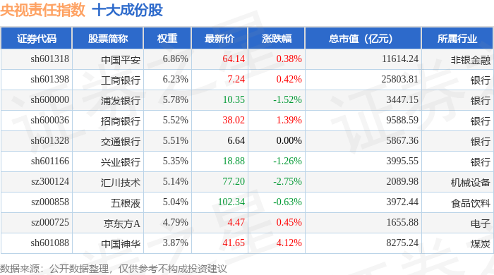 证券之星消息,1月26日,央视责任(399555)指数报收于5299.44点,跌0.05%,成交972.05亿元,换手率0.82%。当日该指数成份股中,上涨的有25家,中国神华以4.12%的涨幅领涨,下跌的有22家,永辉超市以3.82%的跌幅领跌。