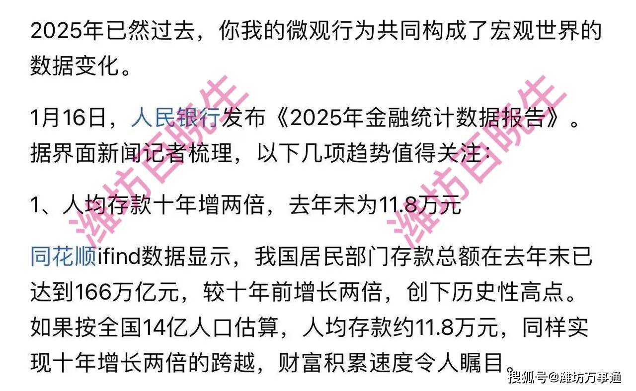 1月16日,去年人均存款11.8万一事上了热搜。就是有媒体报道,根据人民银行发布的《2025年金融统计数据报告》,可以看到我们的人均存款在2025年的时候出现了上升。去年的时候,我们的人均存款达到了11.8万元。当然这个是人均,并不代表每个人都存了那么多。但也可以看得出来,如今存款又流行了起来。很多人开始不愿意把钱用在股票等投资上,更愿意存在银行吃利息了。