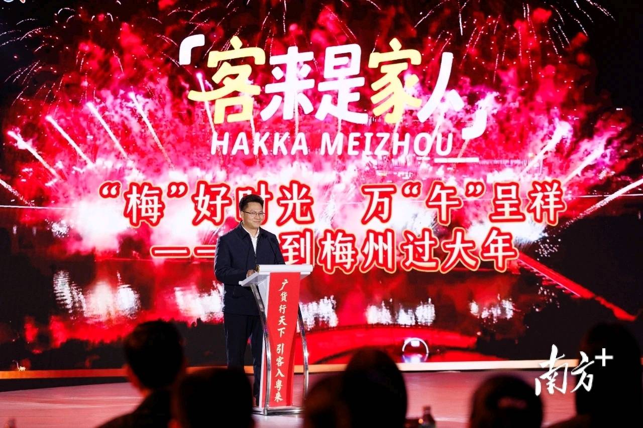佛山市、梅州市文旅部门负责人现场作主题分享推介。梅州市文化广电旅游局分管负责同志向现场领导嘉宾、游客群众、网络直播间观众深情诠释梅州的浓浓年味,对全市景区资源以及非遗美食、特色文创、梅州金柚等名优产品进行了全面介绍,将“乐享暖冬 乐游广东”文旅消费季氛围推向了高潮,并向世界发出“请到梅州过大年”的盛情邀约。