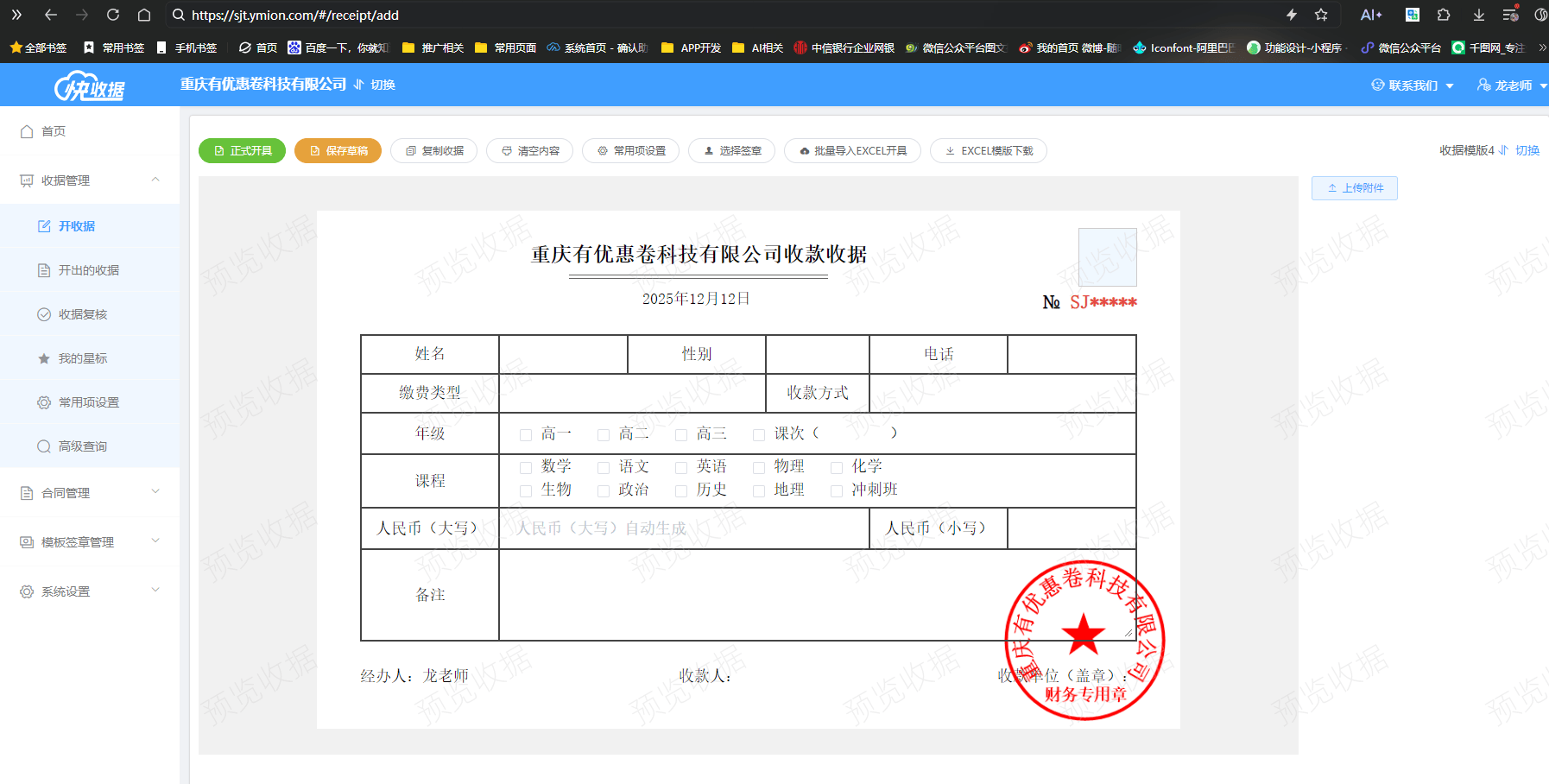 - 点击【开收据】,系统会自动带入客户姓名、金额等信息。