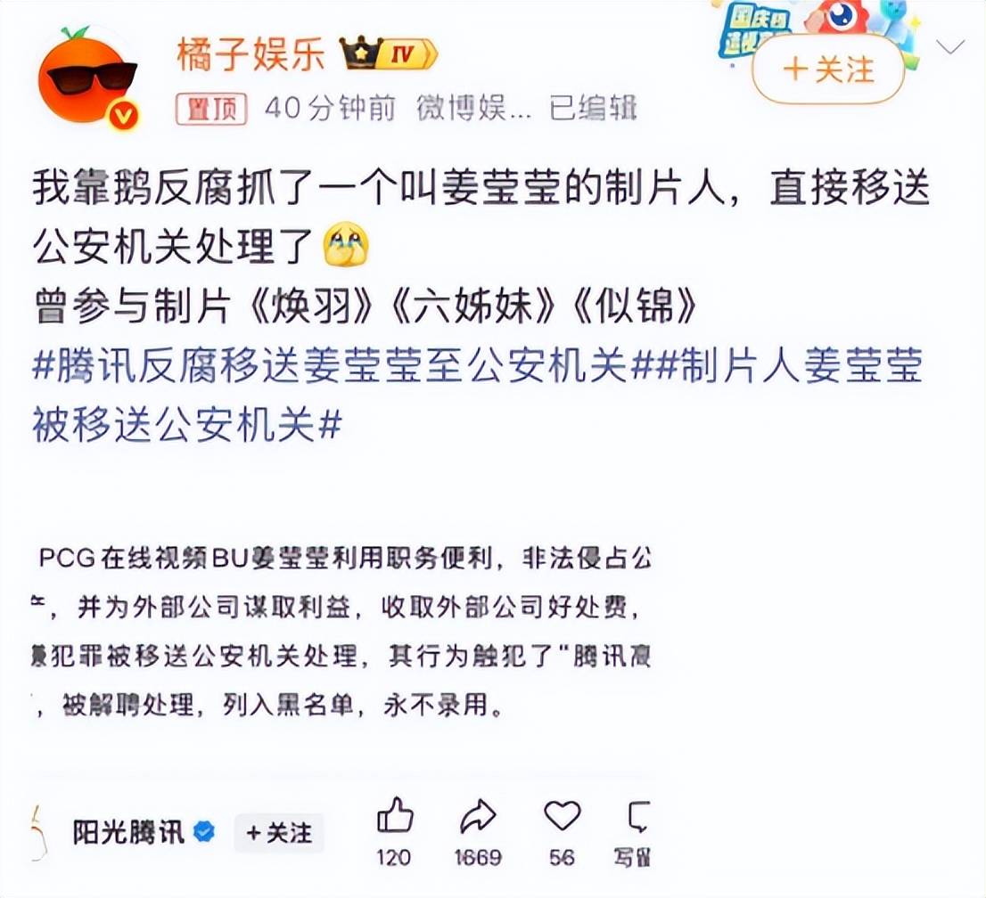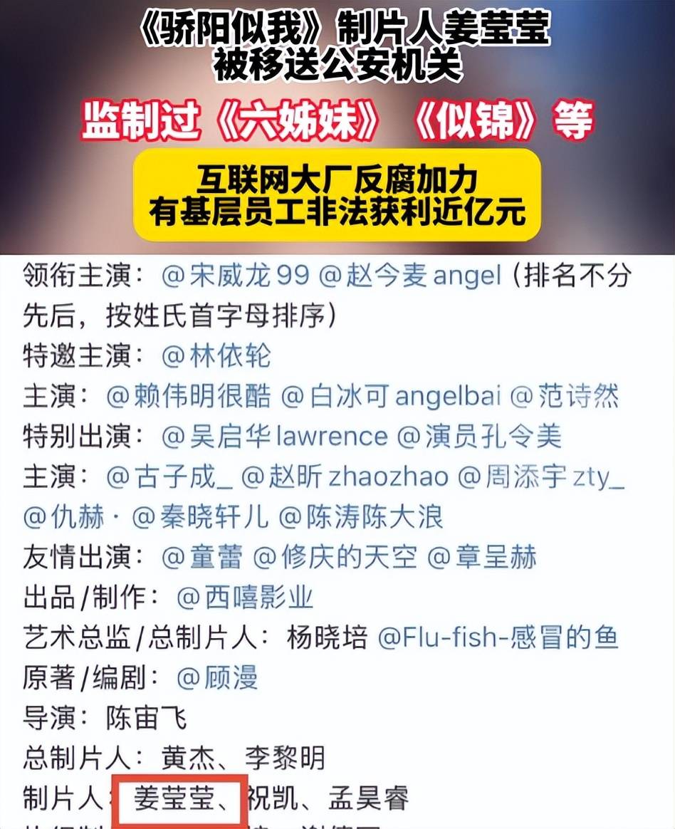 **姜莹莹的堕落** 2026年,娱乐圈迎来了一位因腐败被抓的制片人——姜莹莹。她是腾讯视频的顶级制片人,曾凭借多个出圈的作品迅速崭露头角。她制作的电视剧如《六姊妹》、《似锦》、《骄阳似我》等,都取得了不小的成功,成为业内的标杆人物。短短一年时间,她就凭借多部爆款稳固了自己的位置,成了平台和制作公司争相合作的对象,前途一片光明。