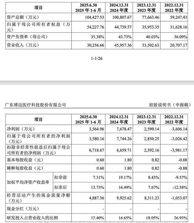 据招股书,2022年-2024年及2025上半年,博迈医疗实现营收分别为2.07亿元、3.35亿元、4.6亿元、3.03亿元;归母净利润分别为-3026.42万元、2850.25万元、7744.26万元、3580.16万元。