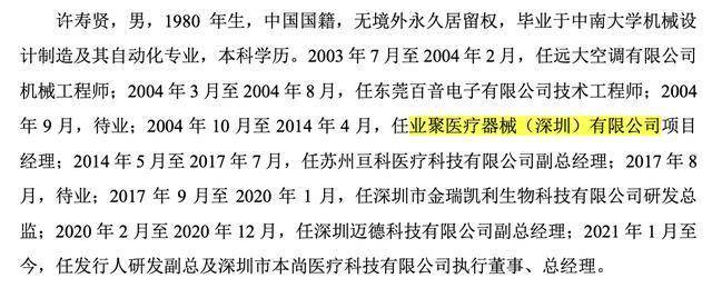 许寿贤与李斌在业聚医疗器械(深圳)任职的时间重合度同样较高,近8年。许寿贤在业聚医疗器械(深圳)干了10年项目经理,离职后并未立即加入博迈医疗,直至2021年才入职,任研发副总。