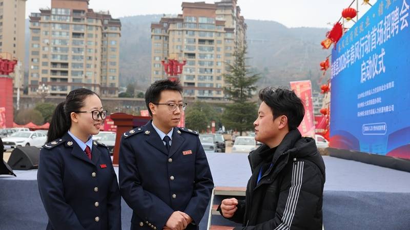 赫章县2026年“寻味夜郎·乐购赫章”新春促消费系列活动中,国家税务总局赫章县税务局深入活动同步跟进、主动靠前、精准发力开展税收服务,图为税务干部在入驻商户招聘时,向活动企划方了解活动详情,沟通活动辅导细节。