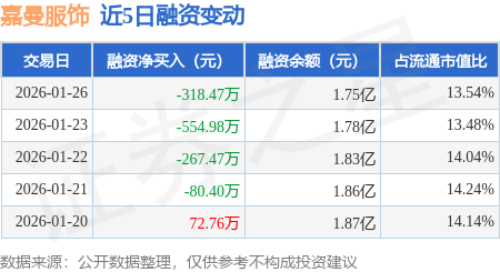 证券之星消息,1月26日,嘉曼服饰(301276)融资买入1135.79万元,融资偿还1454.26万元,融资净卖出318.47万元,融资余额1.75亿元,近20个交易日中有12个交易日出现融资净买入。