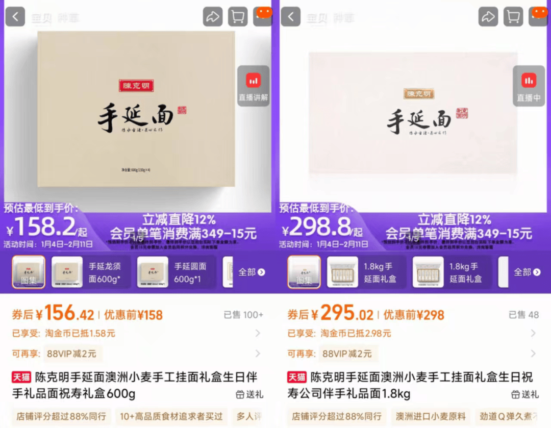 值得一提的是,这两款赠送的面条礼盒并不便宜。在电商平台上搜索相关产品发现,600g陈克明手延面礼盒价格为150元左右,1.8kg的礼盒价格则将近300元,这一价格比市场上的普通面条已然高出数十倍。