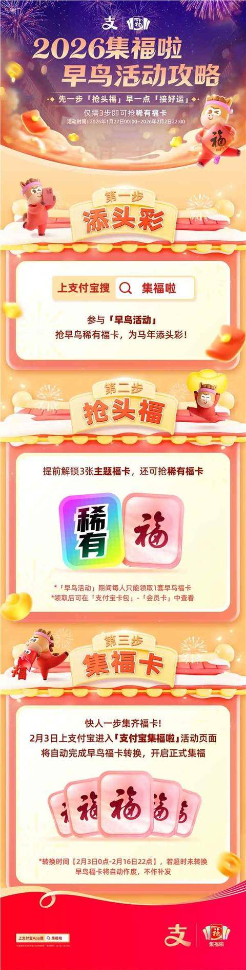 待到2月3日活动正式开启时,用户进入集福活动页面,早鸟卡将自动转化为正式福卡,正式开启集福之旅。
