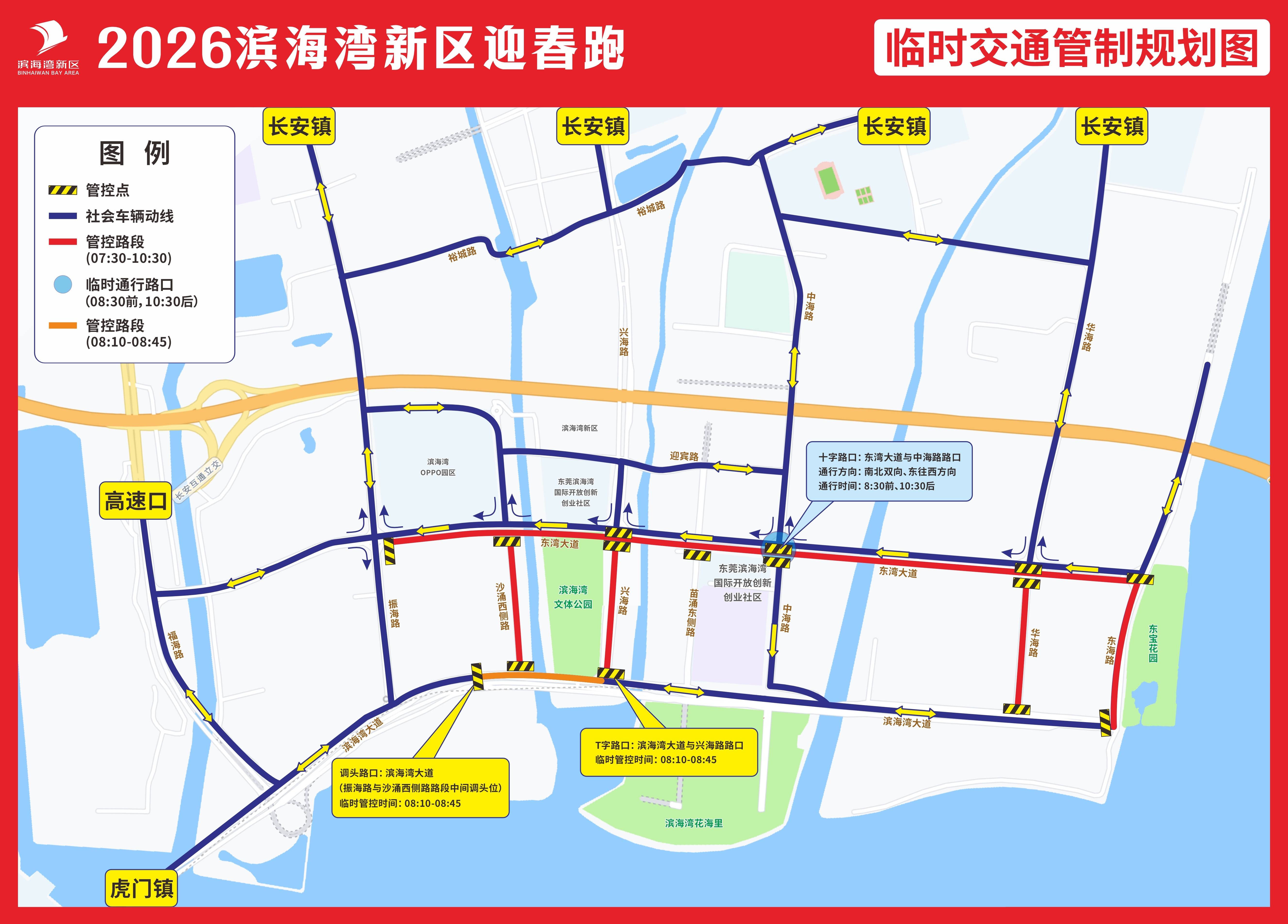“活力滨海湾 奋进‘十五五’”——2026滨海湾新区迎春跑将于2026年1月29日在滨海湾新区举行,为确保活动安全、顺利开展,同时方便群众安全出行,活动期间,东莞市公安局交通管理支队虎门大队将对活动路段及周边道路实行分路段、分时段临时交通管制。