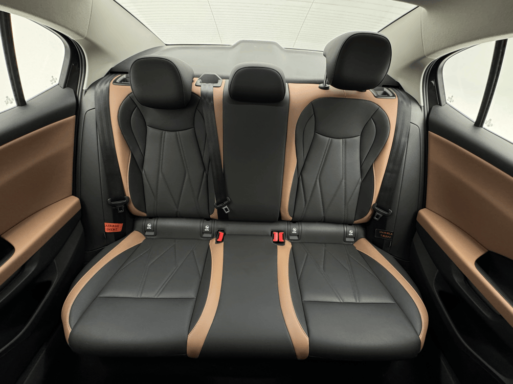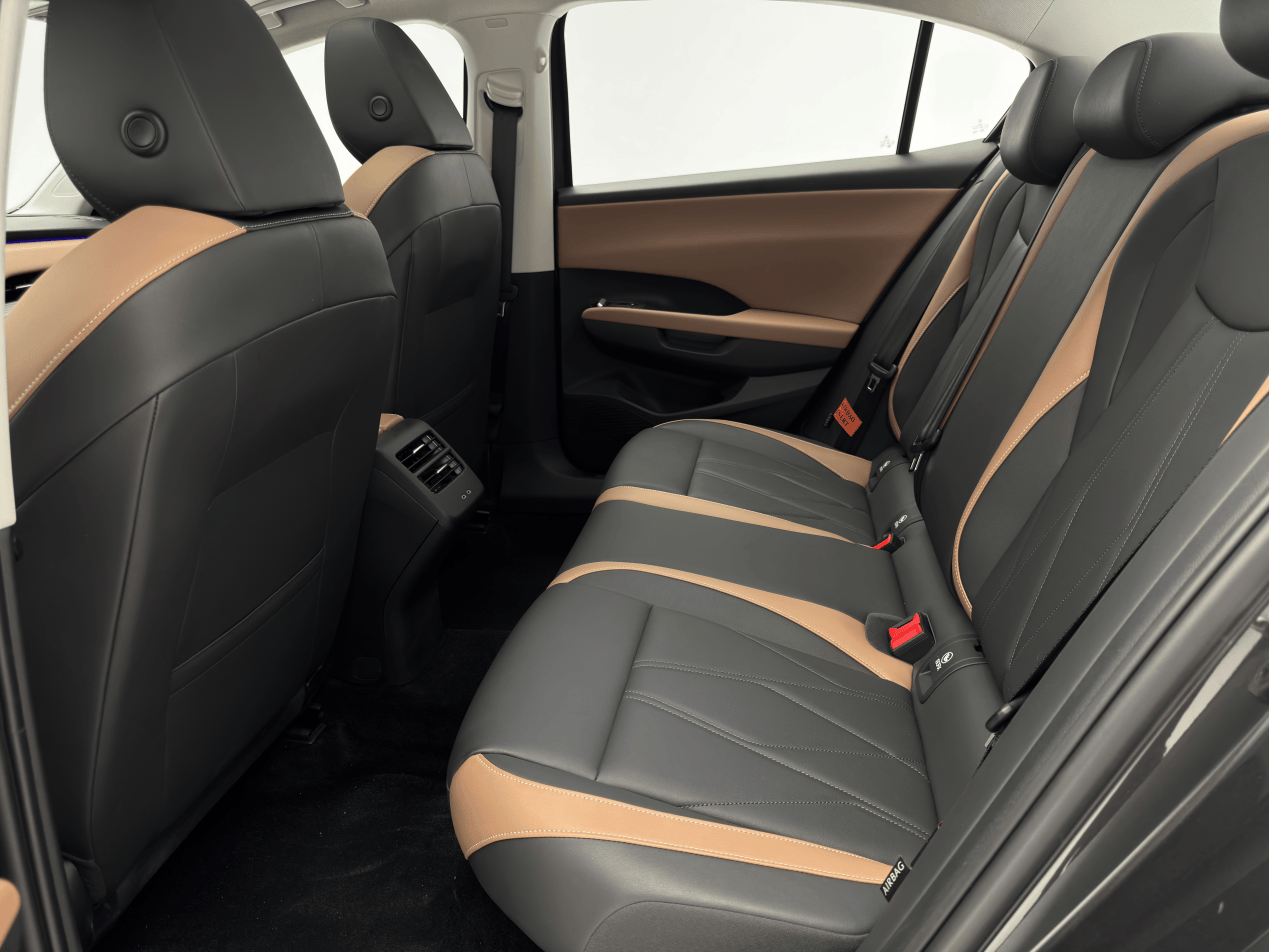 静态体验时笔者实测乘坐:身高181cm的体验者坐进前排,调整至舒适坐姿后头部仍有一拳余量;切换至后排,膝盖距前排座椅超两拳,头部空间充裕,纯平地台设计彻底解决后排中间局促痛点,满载三人也能保证舒适。