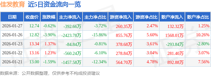 证券之星消息,截至2026年1月27日收盘,佳发教育(300559)报收于12.74元,下跌0.62%,换手率2.69%,成交量8.37万手,成交额1.06亿元。