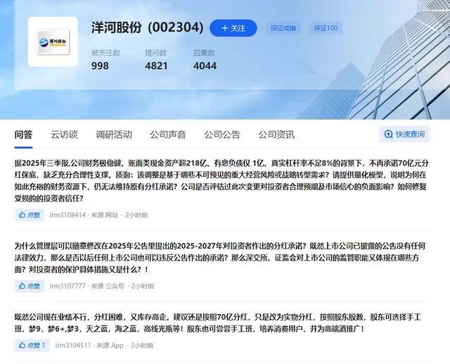 洋河股份为何在财务稳健的情况下,仍取消70亿元保底分红?要求披露调整原因及量化依据;不满管理层随意修改公告承诺的行为,质疑公告的法律效力;甚至有投资者提出“实物分红”的替代方案,希望公司以产品抵分红,既兑现承诺又去库存。