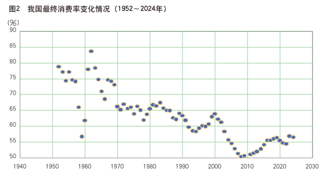 最后,最终消费率相对偏低,亟须促进经济结构转型。2011年以来,虽然我国最终消费率有小幅攀升的趋势,但是攀升速度较慢。2024年,我国消费率为56.6%,不仅低于发达国家80%以上的水平,也低于世界平均77%的水平,甚至低于新兴经济体(印度为66%、越南为74%)的水平。其中,我国居民消费率仅为40%左右,低于全球56.6%的均值水平。最终消费率偏低是我国经济结构性矛盾的集中体现,源自我国消费供给结构不合理、收入分配机制有待优化、社会保障体系尚需健全等方面的因素,需要通过进一步全面深化改革,逐步构建有利于提振消费特别是居民消费的长效机制。