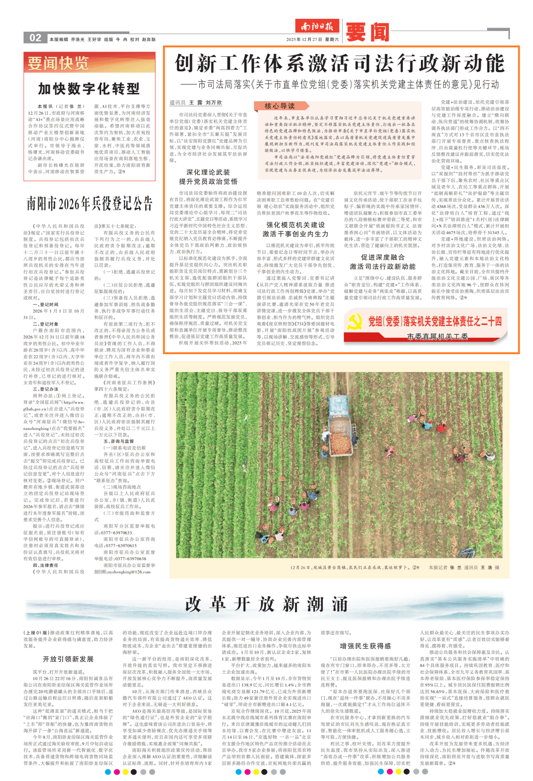 12月27日,《南阳日报》以《创新工作体系激活司法行政新动能——市司法局落实<关于市直单位党组(党委)落实机关党建主体责任的意见>见行动》为题,报道了南阳市司法局党委党建引领业务发展,为全市经济社会发展提供法治保障的有关情况。具体内容如下: