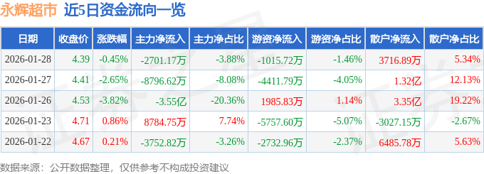 证券之星消息,截至2026年1月28日收盘,永辉超市(601933)报收于4.39元,下跌0.45%,换手率1.74%,成交量158.24万手,成交额6.96亿元。