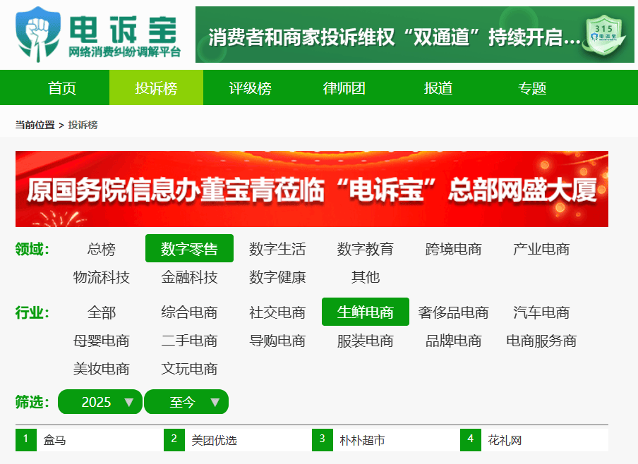 根据“电诉宝”2025至今受理的数字零售中 生鲜电商 领域用户有效投诉显示(依据投诉量排行),“朴朴超市 ”排在 第3名 ,最新 评级 为 “不予评级” ,除此之外,其他被投诉的类似电商平台还有: 盒马、 美团优选、花礼网 。