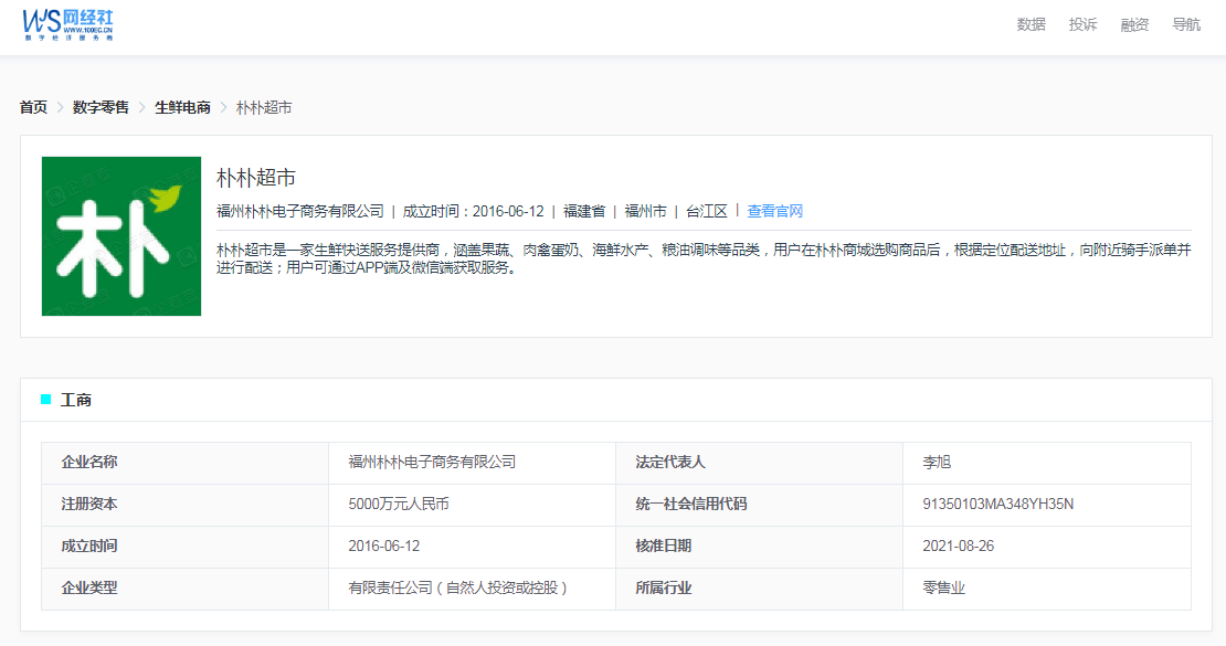 据网经社企业库显示,“朴朴超市 ” 隶属于 福州朴朴电子商务有限公司 ,该公司成立于2016年6月12日,法定代表人为 李旭 。朴朴超市自称是一家生鲜快送服务提供商,涵盖果蔬、肉禽蛋奶、 海鲜 水产 、粮油调味等品类,用户在朴朴商城选购商品后,根据定位配送地址,向附近骑手派单并进行配送;用户可通过APP端及微信端获取服务。