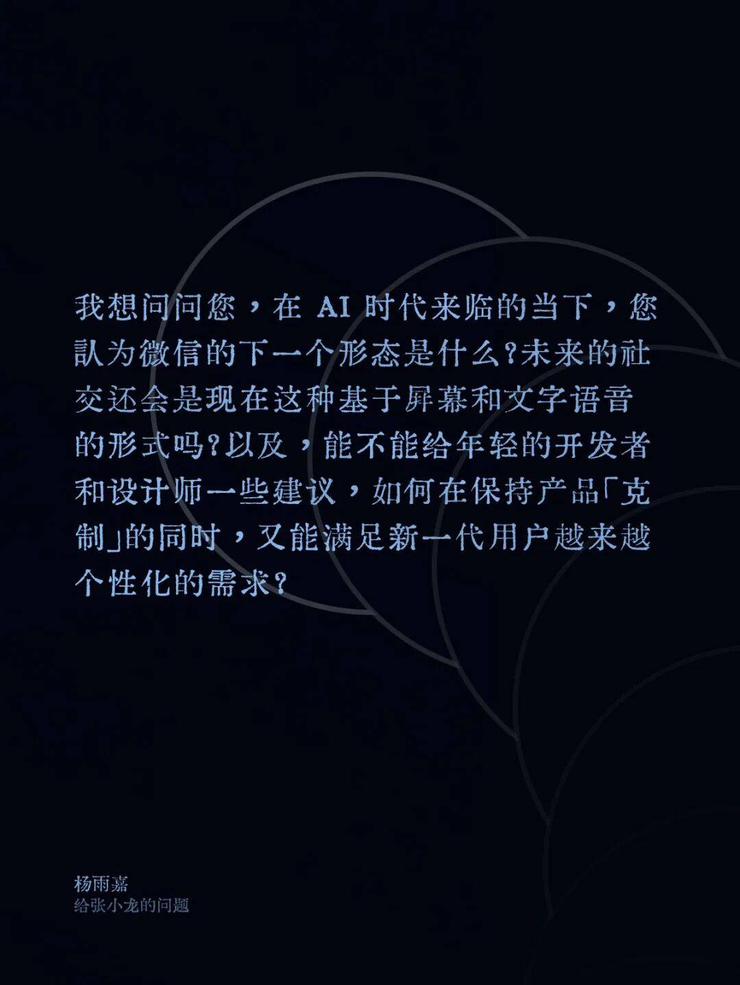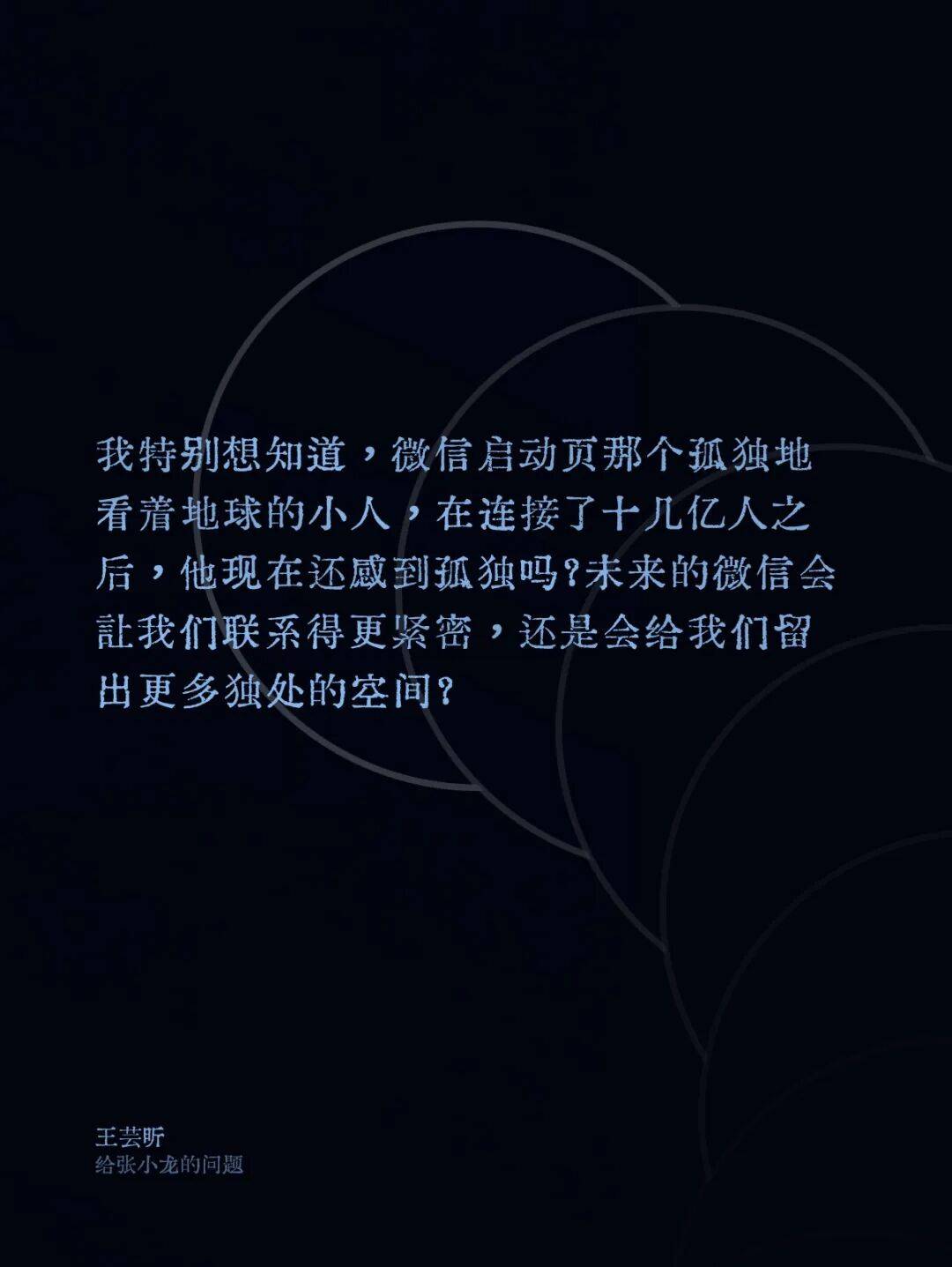 「我特别想知道,微信启动页那个孤独地看着地球的小人,在连接了十几亿人之后现在还感到孤独吗?未来的微信会让我们联系得更紧密,还是会给我们留出更多独处的空间?」
