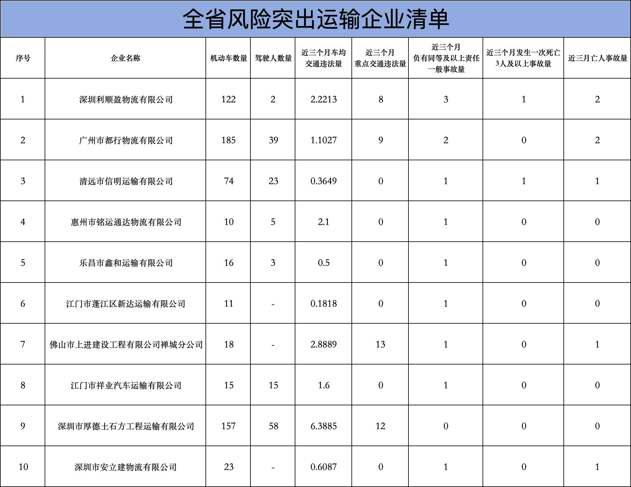 岁末年终,随着能源保供、民生保障等物资运输需求旺盛,客货运输交织叠加,重点区域、重要通道流量聚集,道路客货运输将持续保持高位运行。经排查,此次曝光的风险突出运输企业共10家,包括深圳利顺盈物流有限公司、广州市都行物流有限公司、清远市信明运输有限公司、惠州市铭运通达物流有限公司、乐昌市鑫和运输有限公司、江门市蓬江区新达运输有限公司、佛山市上进建设工程有限公司禅城分公司、江门市祥业汽车运输有限公司、深圳市厚德土石方工程运输有限公司、深圳市安立建物流有限公司。其中,深圳利顺盈物流有限公司、清远市信明运输有限公司等单位近三个月发生了重点运输车辆肇事导致的较大交通事故,广州市都行物流有限公司发生重点运输车辆负全部或者主责的亡人交通事故。