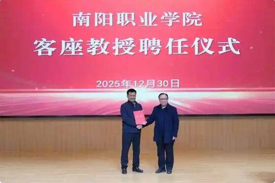南阳职业学院党委副书记、校长郭建生代表学校向邓志军颁发客座教授聘书。