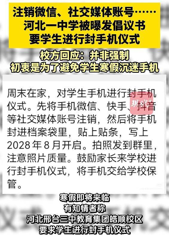 寒假即将来临,河北邢台三中教育集团皓顺校区要求学生进行封手机仪式。对此网友们热议,有的支持,但也有人认为此举限制了学生自由,过于离谱等。