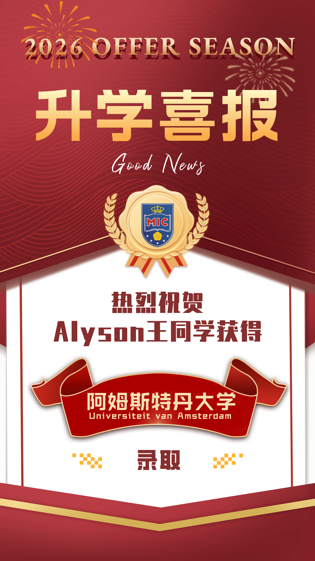 Alyson王同学一举拿下传媒专业排名全球第一的阿姆斯特丹大学录取!