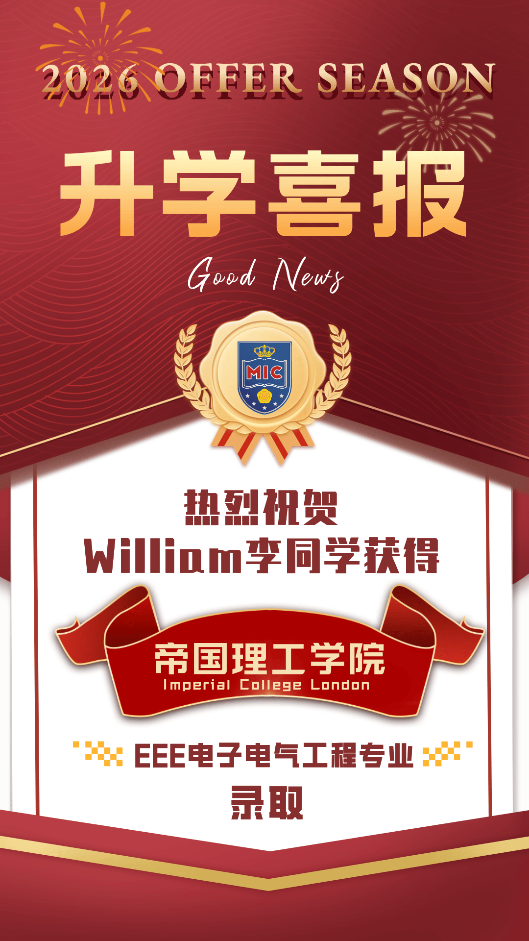 With exceptional prowess, student William Li has successfully secured an offer for the intensely competitive Electrical and Electronic Engineering (EEE) program at Imperial College London (ranked 2nd in the QS World University Rankings)! This admission, renowned for its high difficulty level, represents a truly remarkable achievement!