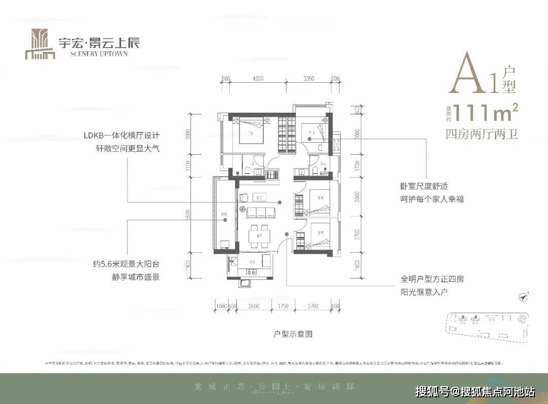 111㎡的4房2厅2卫,南北通透格局,客餐厅5.6米开间,LDKB一体化,五开间朝南,客厅连接餐厅位出5.6米长的大阳台,L型厨房,公卫生三段式分离。阳台主朝西南向,得房率约76%(不含赠送),加上赠送后得房率约89.48%。