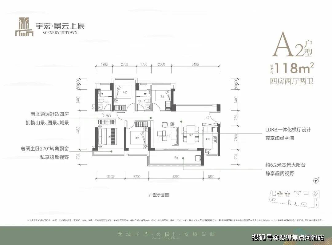 118㎡的4房2厅2卫,横厅南北通透格局,客餐厅6.2米开间,LDKB一体化,五开间朝南,西北面5.4米长的观景大飘窗,客厅连接餐厅位出6.2米长的大阳台,L型厨房,卫生间干湿分离。东南朝向,得房率约76%(不含赠送),加上赠送后得房率约91.62%。