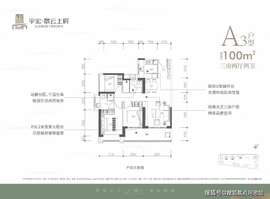 100㎡的3房2厅2卫,竖厅格局,客厅3.6米开间,LDKB一体化,三开间朝南,客厅连接次卧出6.2米长的大阳台,U型厨房,卫生间干湿分离。东南朝向,得房率约76%(不含赠送),加上赠送后得房率约89.52%。