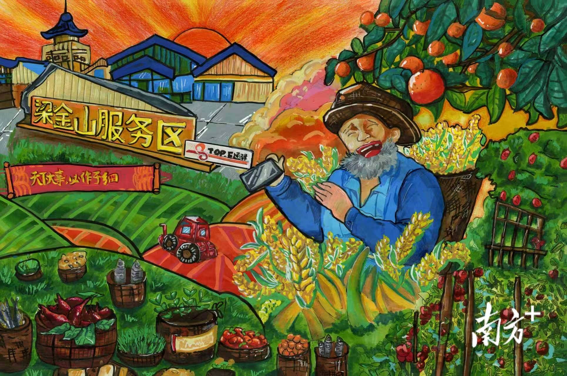 粤运交通粤东分公司经理龙奇峰的儿子龙泽安,假期陪爸爸在服务区值班,于是创作了作品《高速乐园:梁金山服务区梦》,荣获最佳主题表达奖。他说:“这是我去年在梁金山服务区看到的画面,老爷爷笑容满面地向人们售卖新鲜农产品,画面特别温暖幸福。”