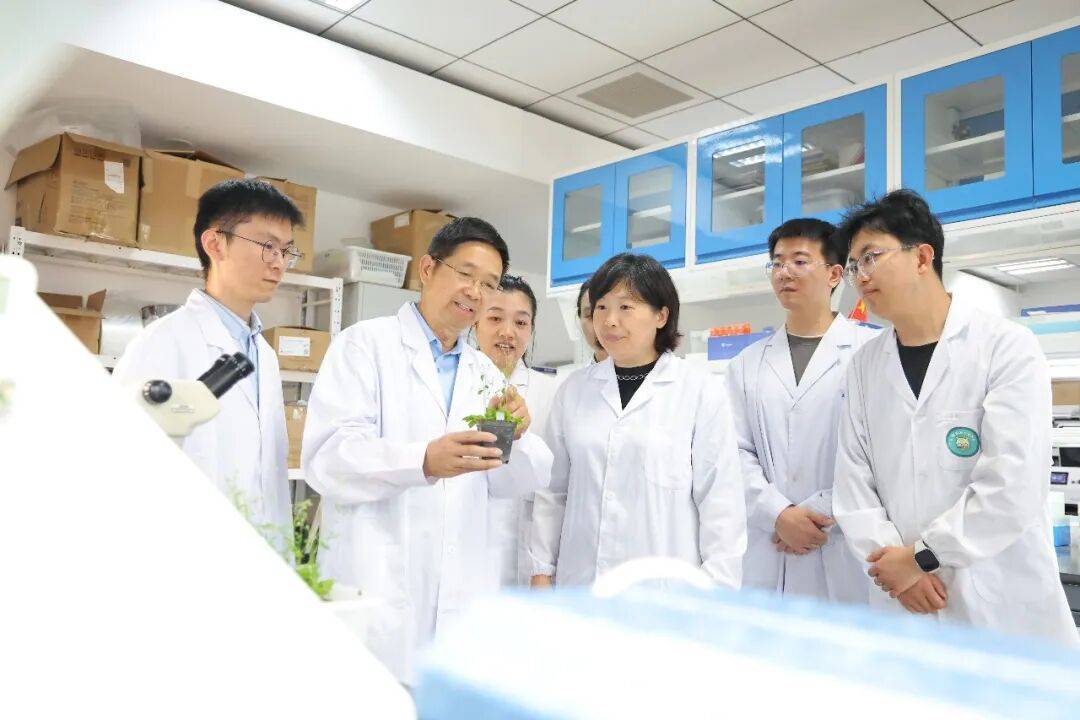 张宪省教授与苏英华教授及团队成员观察拟南芥的发育情况(图片来源:山东农业大学)