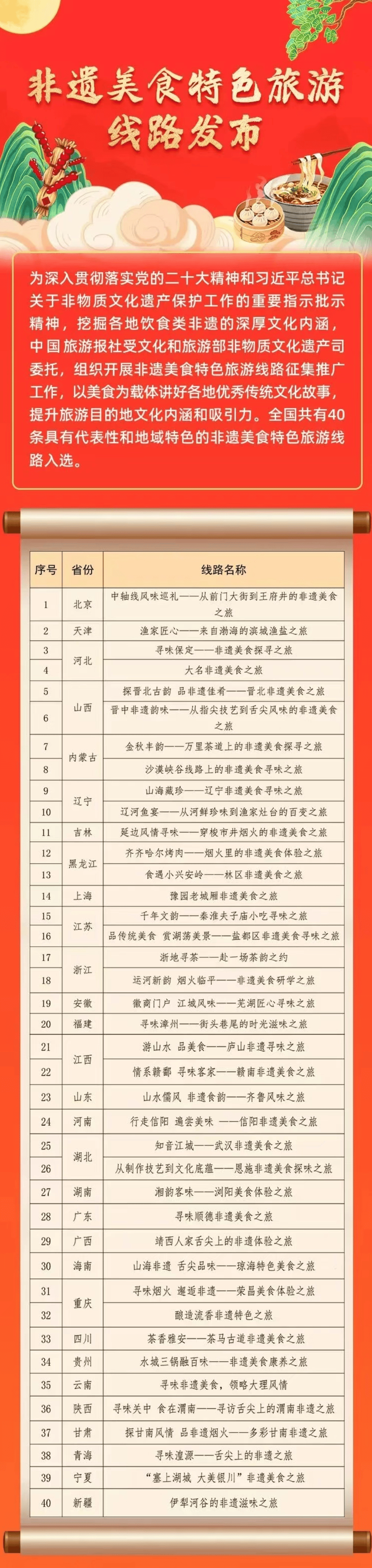 此次线路征集工作由文化和旅游部非物质文化遗产司委托中国旅游报社开展,自2025年8月启动以来共收到全国各地报送的非遗美食特色旅游线路170条。此次发布的40条线路如同一场跨越中国的味觉旅行推荐: