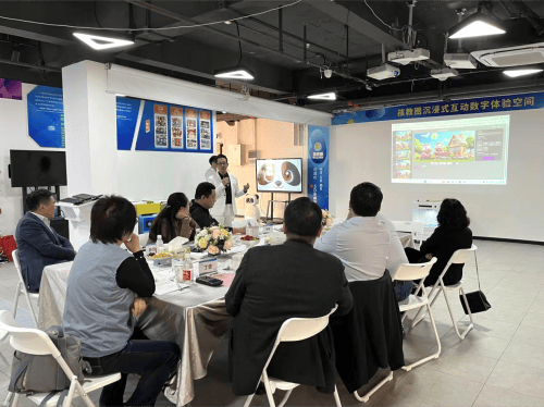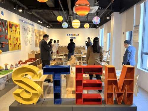 领导一行还参观了融合工程建构、人工智能与编程的STEAM教室,以及涵盖糖画、扎染、剪纸等非遗主题的十大非遗文化教室,对晔生科技在特色教室建设方面的成果表示肯定。
