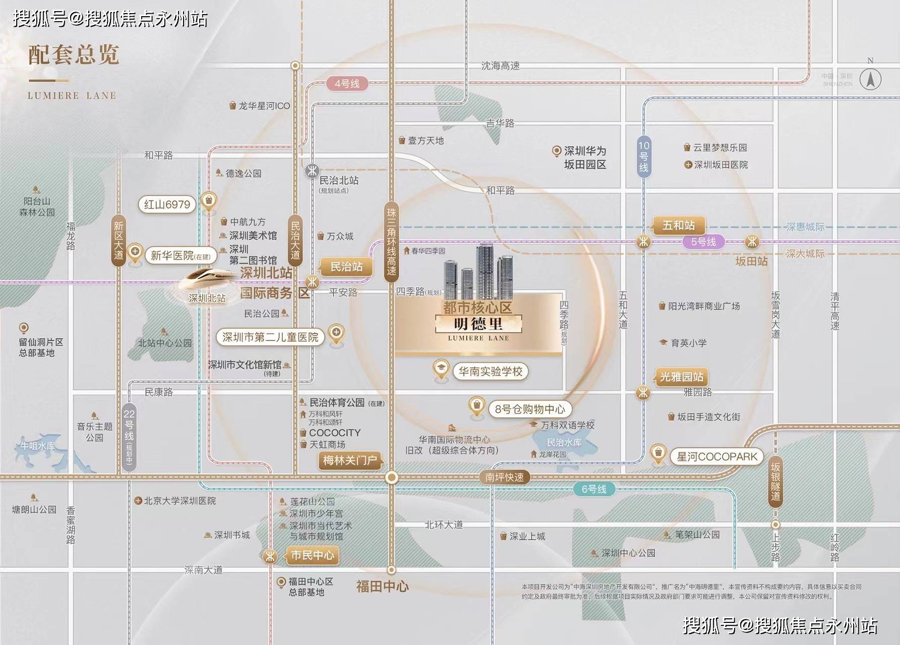 项目周边有多条地铁线路,如距离约1.1公里的民治地铁站(5号线、规划中22号线)和约1.3公里的五和地铁站(5号线、10号线),公共交通便利。